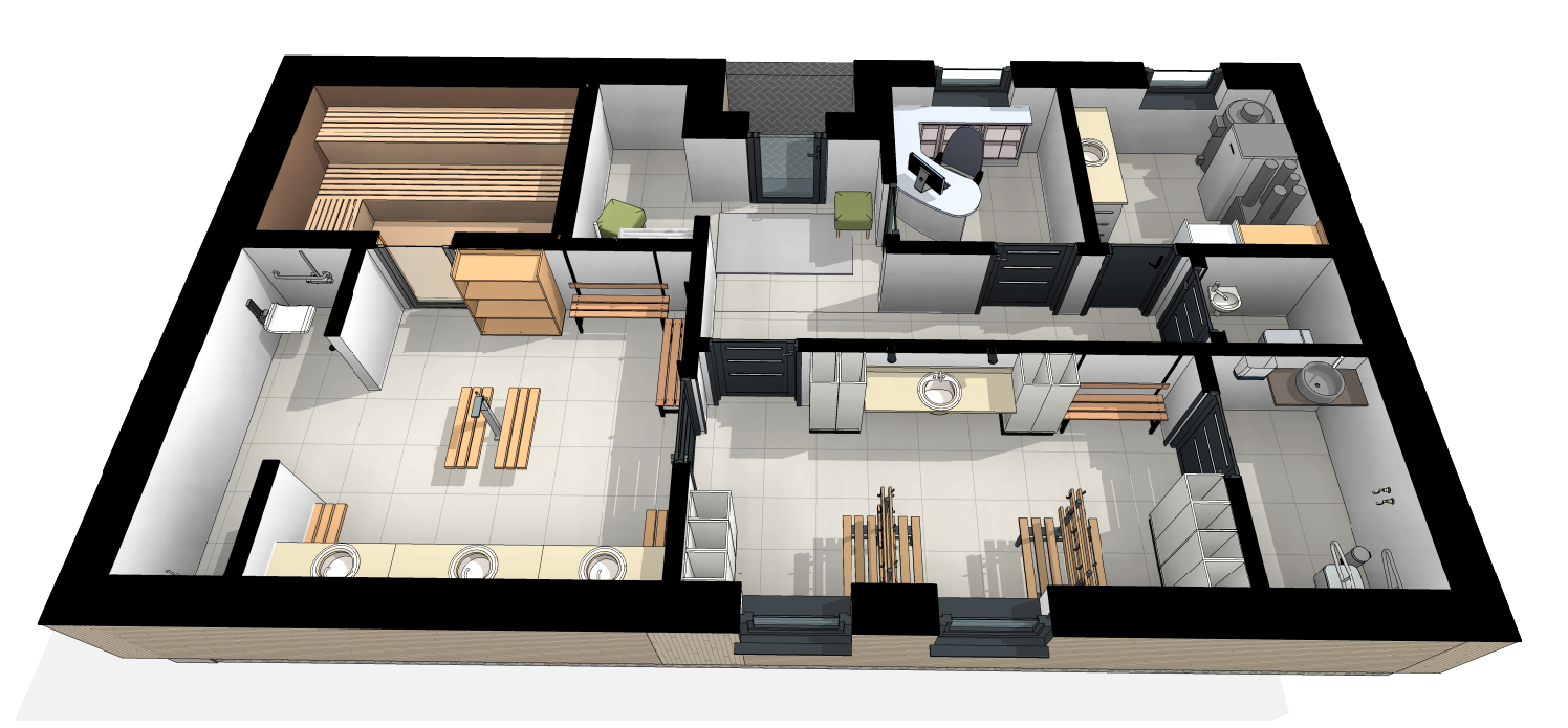 Pagal parengtus projektinius pasiūlymus, tai bus vieno aukšto, apie 75 kvadratinių metrų ploto pastatas. Jame numatytos visos reikalingos patalpos: persirengimo kambariai, dušinės, pirties zona, sanitariniai mazgai, taip pat erdvės darbuotojams ir techninei įrangai.